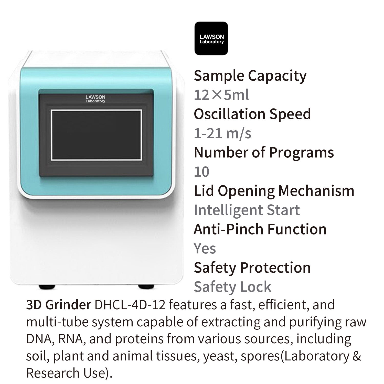 LAWSON Laboratory 3D Grinder DHCL-4D-12 / DHCL-4D-24 features a fast, efficient, and multi-tube system capable of extracting and purifying raw DNA, RNA, and proteins from various sources, including soil, plant and animal tissues, yeast, spores(Laboratory & Research Use).