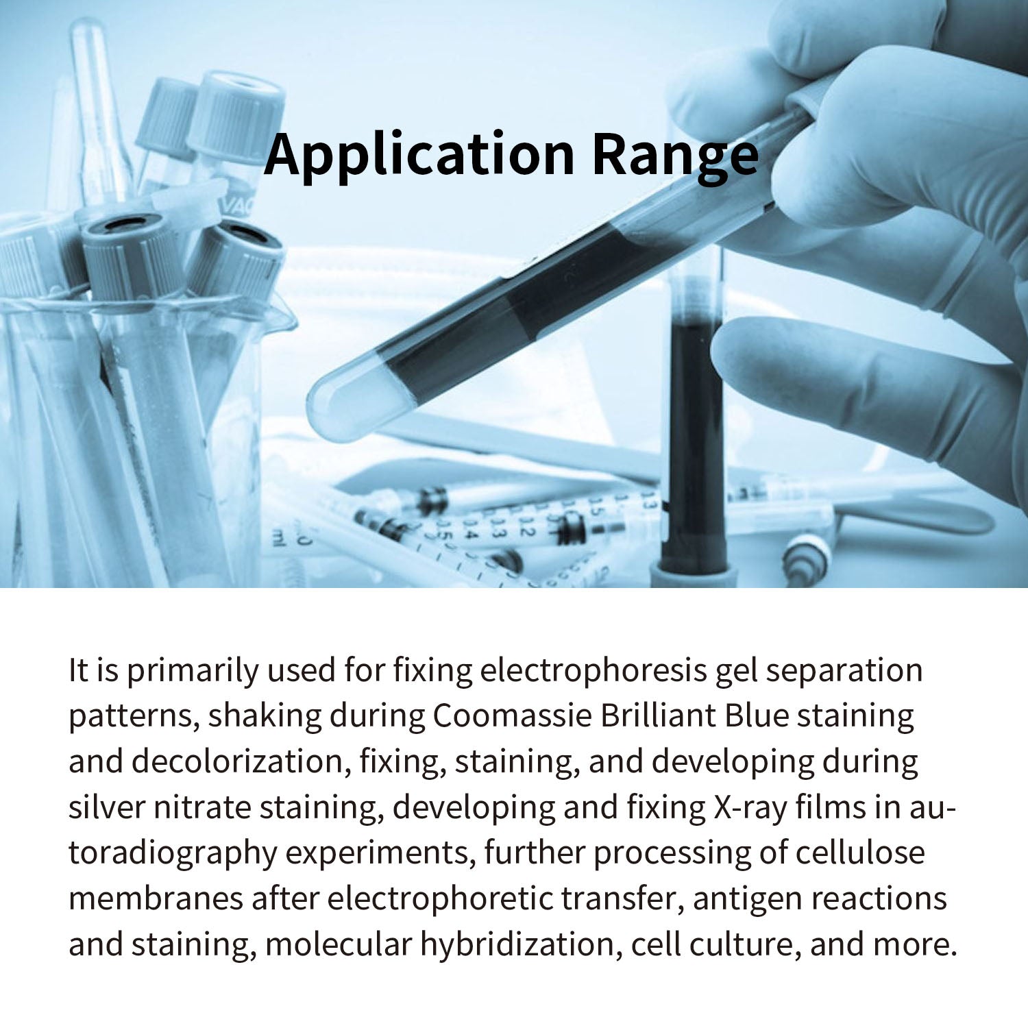 Decolorization shaker is suitable for mixing liquids in various types of flasks, beakers, and petri dishes. It is primarily used for fixing electrophoresis gel separation patterns, shaking during Coomassie Brilliant Blue staining and decolorization, fixing, staining, and developing during silver nitrate staining, developing and fixing X-ray films in autoradiography experiments, further processing of cellulose membranes after electrophoretic transfer, antigen reactions and staining, molecular hybridization, cell culture, and more.