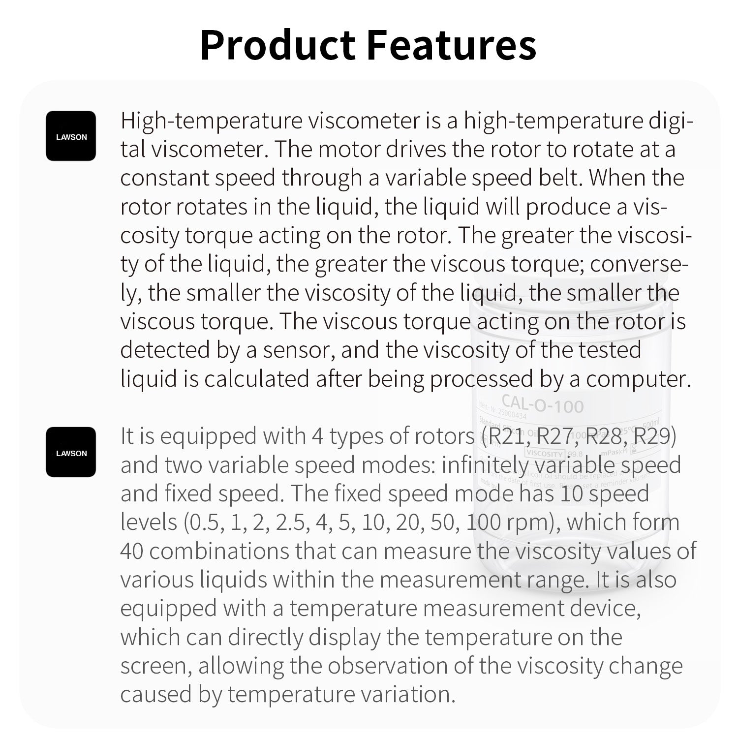 - It is equipped with 4 types of rotors (R21, R27, R28, R29) and two variable speed modes: infinitely variable speed and fixed speed. The fixed speed mode has 10 speed levels (0.5, 1, 2, 2.5, 4, 5, 10, 20, 50, 100 rpm), which form 40 combinations that can measure the viscosity values of various liquids within the measurement range. It is also equipped with a temperature measurement device, which can directly display the temperature on the screen, allowing the observation of the viscosity change caused by temperature variation.