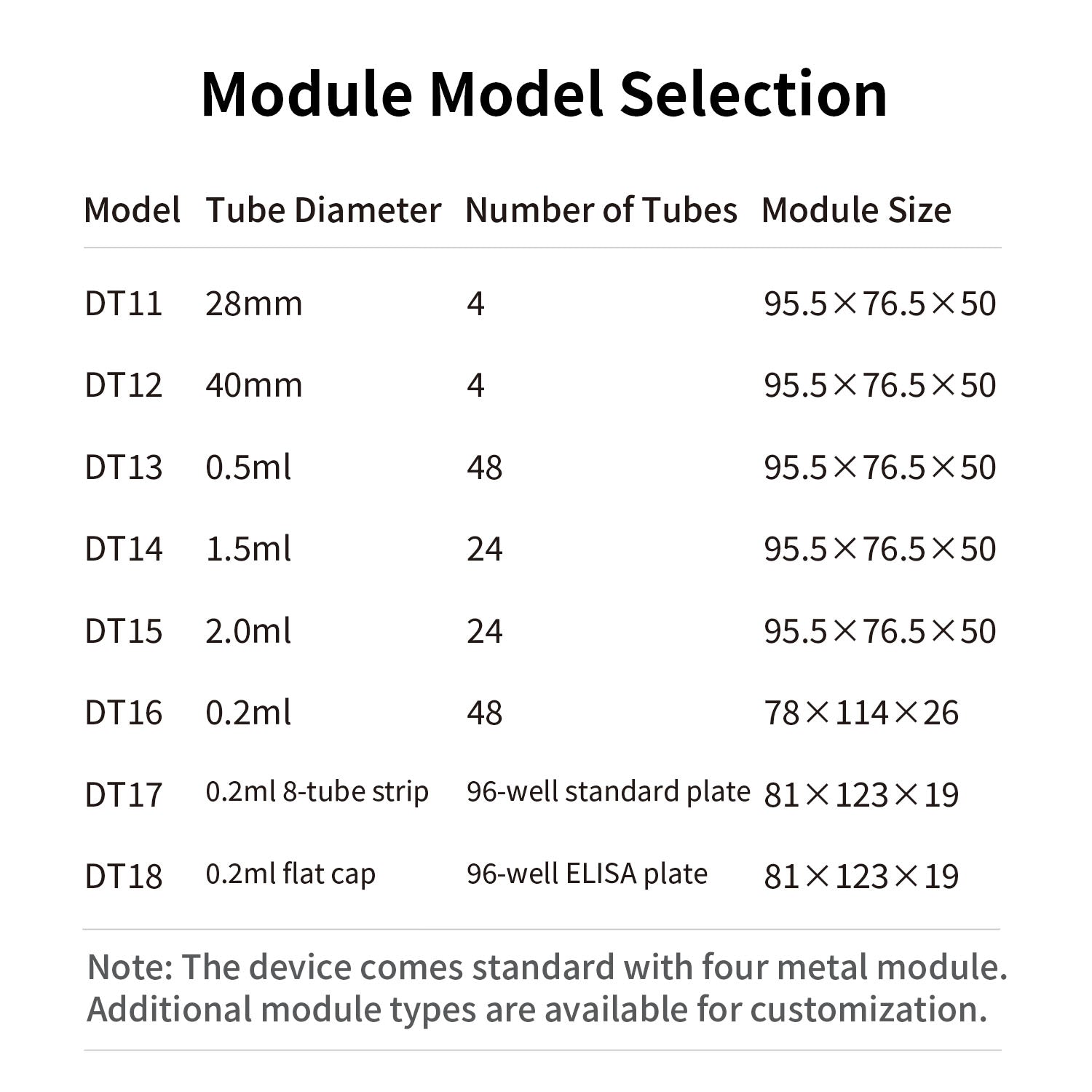 Model | Test Tube Diameter | Number of Test Tubes | Module Size |