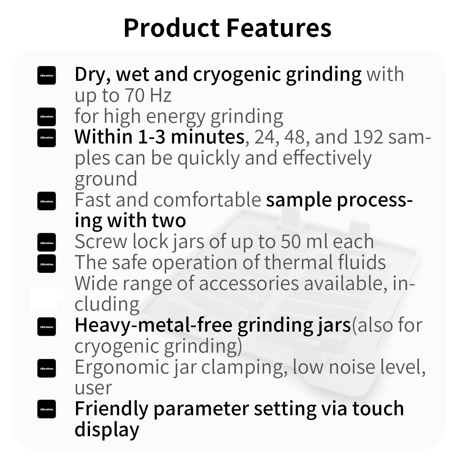 - Within 1-3 minutes, 24, 48, and 192 samples can be quickly and effectively ground
