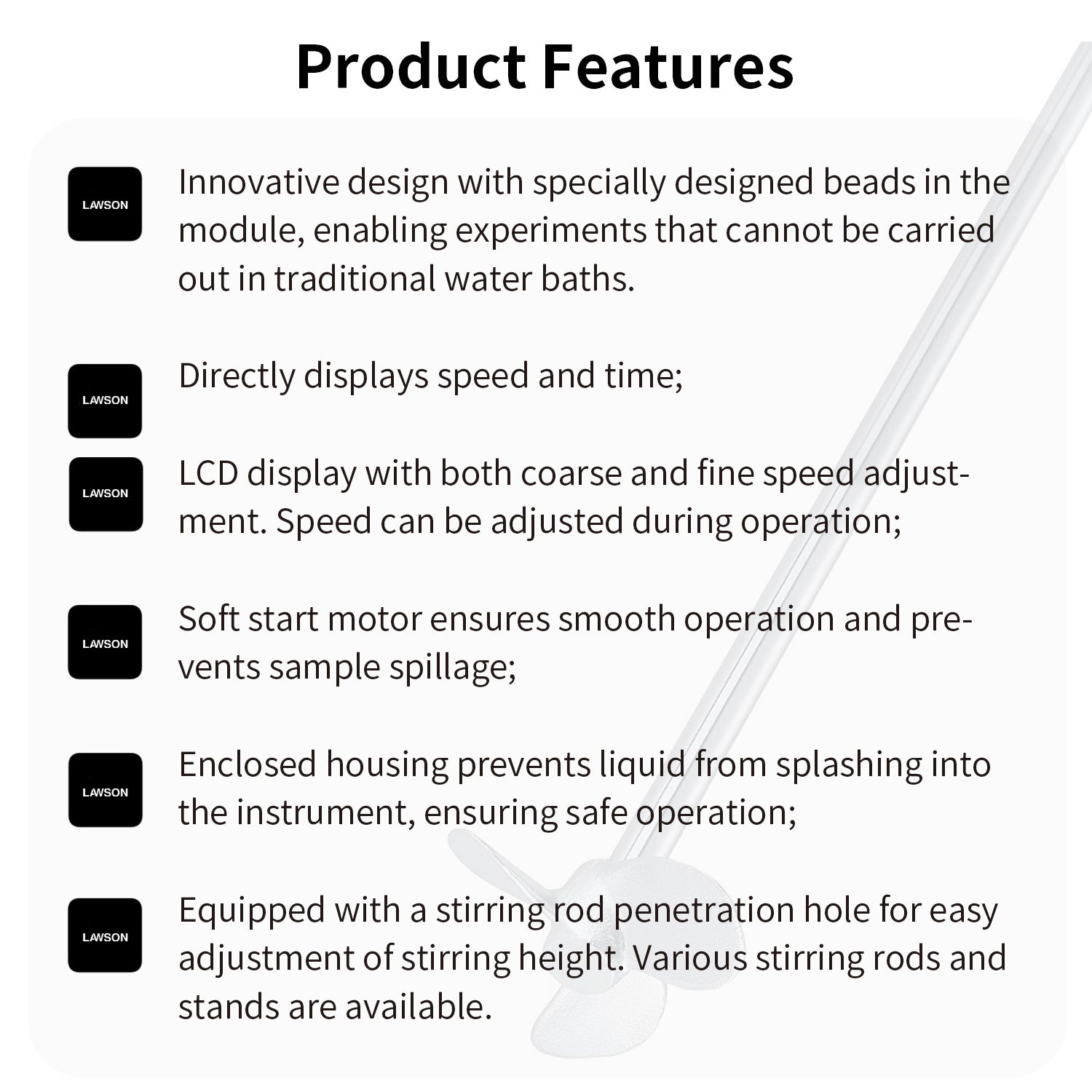 Main Features ○ Directly displays speed and time; ○ LCD display with both coarse and fine speed adjustment. Speed can be adjusted during operation; ○ Soft start motor ensures smooth operation and prevents sample spillage; ○ Enclosed housing prevents liquid from splashing into the instrument, ensuring safe operation; ○ Equipped with a stirring rod penetration hole for easy adjustment of stirring height. Various stirring rods and stands are available.
