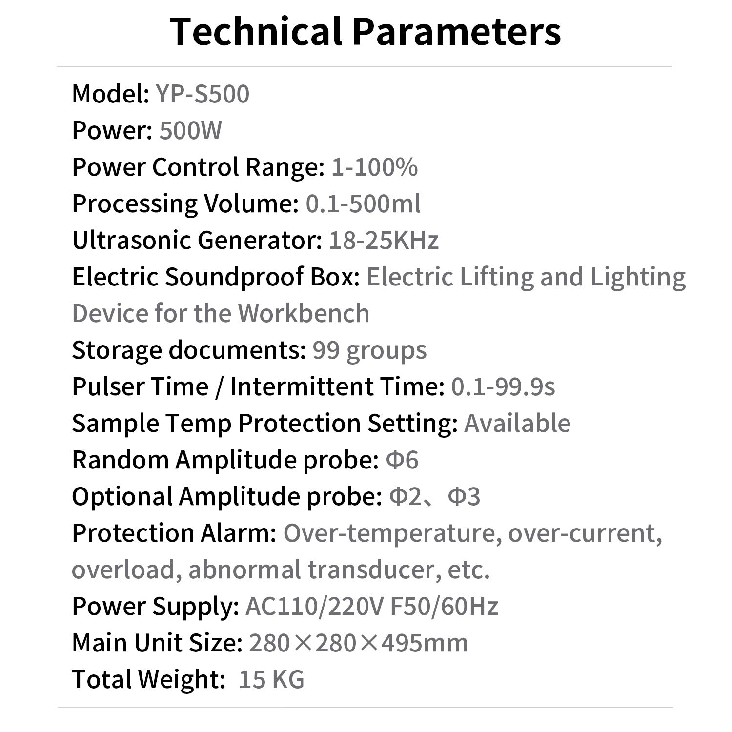 - 5~500W ultrasonic homogenizer can safely process various organic and inorganic materials, from 100 microliters to 500 milliliters.